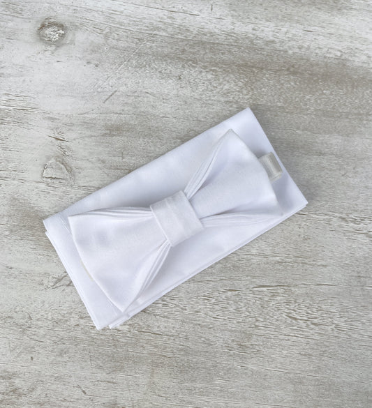 White Bow Tie | Suspenders | Pocket Square Set for Men | Ring Bearer Gift for Boys - Perfect for Weddings | Christenings | and Baptisms