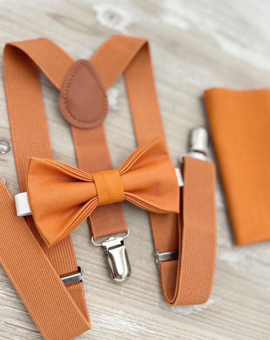 Burnt Orange Bow tie & Suspenders | Pocket Square | Ring Bearer Outfit | Boho Rustic Wedding