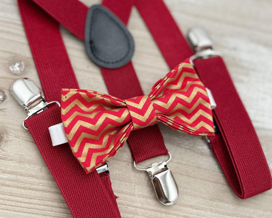 Chevron Bow tie & Suspenders | Red Gold Bow Bow Tie | Holiday Bowtie | Costume Outfit | Christmas Bow Tie | Photo Prop Outfit