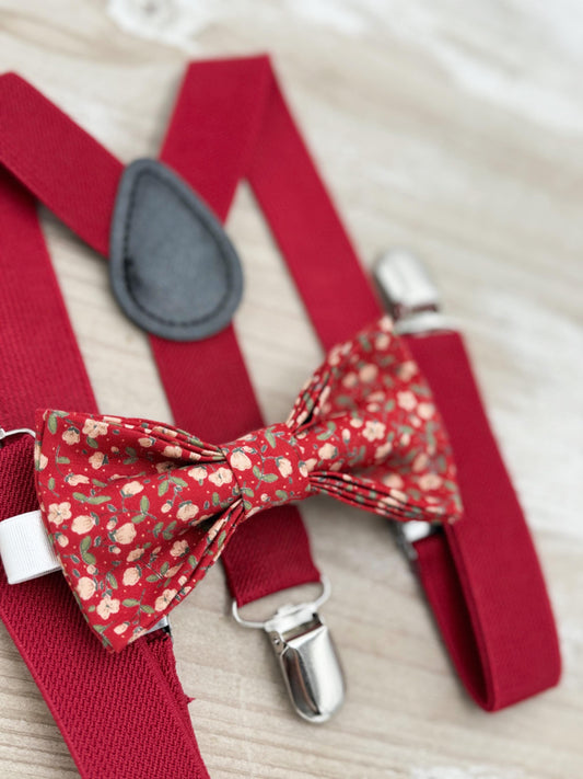 Floral Red Bow tie & Suspenders, Vintage Bowtie, Ring Bearer Outfit, Boho Rustic Wedding, Cottage Chic Outfit