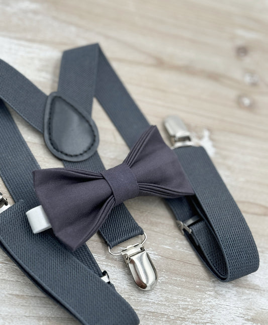Dark Gray Bow tie & Suspenders, Charcoal Braces, Ring Bearer Outfit, Boho Rustic Wedding Set, Groomsman Gift