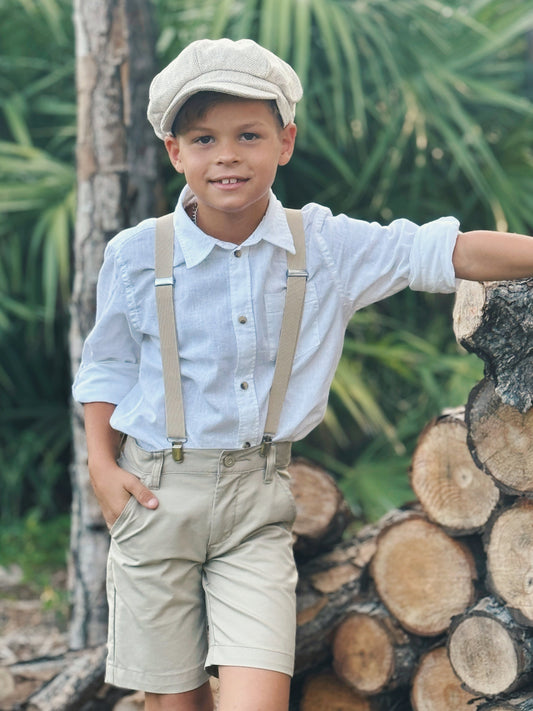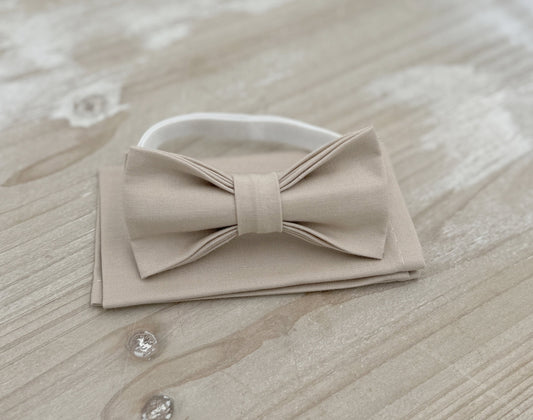 Almond Bow Tie & Suspenders Set - Ring Bearer and Groomsman Outfit, Rustic Wedding, Biscotti Pocket Square, All Sizes Baby to Adult