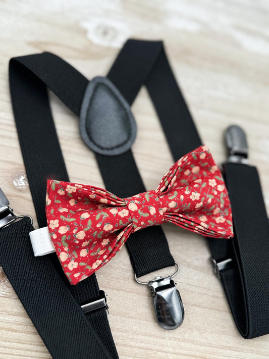 Floral Red Bow tie & Suspenders | Back Braces | Vintage Bowtie | Ring Bearer Outfit | Boho Rustic Wedding | Cottage Chic Outfit