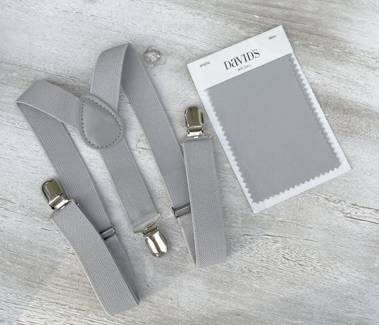 Ice Blue Bow Tie | Light Gray Suspenders | Men's Pocket Square Set - Perfect Wedding Groomsmen Gift and Ring Bearer Toddler Gift