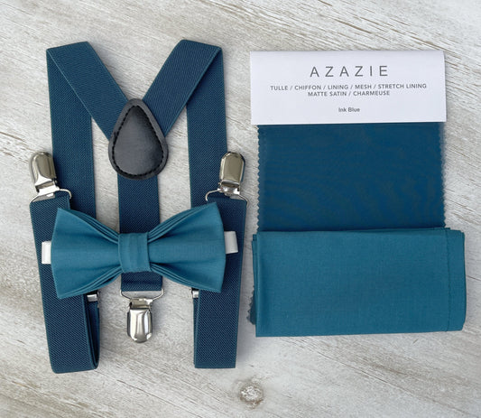 Teal Blue Bow Tie | Ink Blue Suspenders | Men's Pocket Square Set for Wedding - Groomsmen Gift and Ring Bearer Accessory