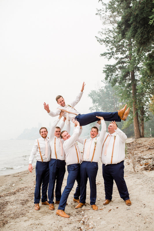 Pearl Pink Bow Tie | Light Brown Leather Suspenders | Men's Pocket Square - Perfect Wedding Outfit for Groomsmen and Ring Bearers