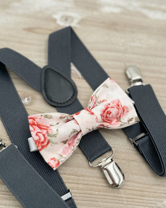 Floral Bow tie & Suspenders | Charcoal Dark Gray Braces | Cottage Chic Bow Tie | Ring Bearer Outfit | Boho Wedding | Groomsman Gift