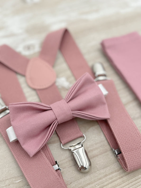 Dusty Rose Bow Tie and Suspenders Set – All Sizes for Men and Boys, Pocket Square, Ring Bearer Outfit, Groomsman Gift, Boho Barn Wedding