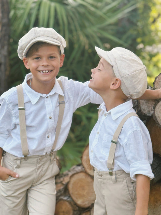 Tweed Newsboy Cap | Skinny Leather Suspenders | Linen Dusty Rose Bow Tie | Ring Bearer Outfit | Cake Smash Outfit | Wedding Set