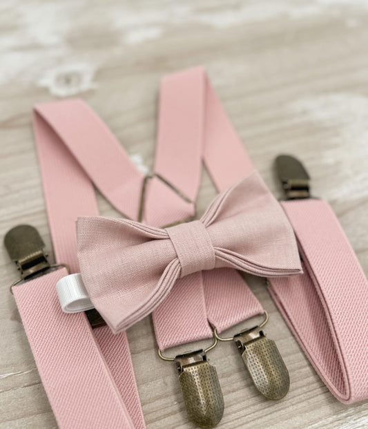 Vintage Rose Bow tie & Suspenders, Dusty Pink X - Back Braces, Linen Cameo BowTie, Ring Bearer Outfit, Boho Rustic Wedding