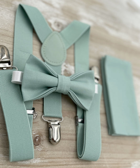 Dusty Sage Bow Tie & Suspenders – Ring Bearer Outfit, All Sizes Baby to Adult, Groomsman Gift, Pocket Square, Boho Wedding Set