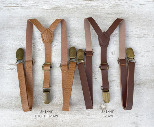 Rustic Wedding Cognac Brown Skinny Vegan Leather Suspenders Set for Groomsmen and Ring Bearer Outfits