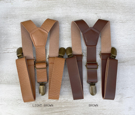 Rustic Brown Vegan Leather Wedding Suspenders for Groomsmen and Ring Bearer Outfit