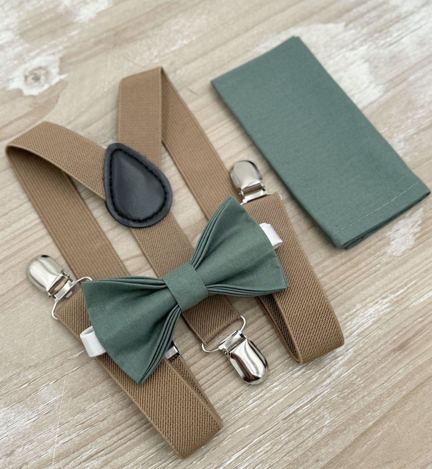 Eucalyptus Bow Tie & Suspenders – All Sizes for Men and Boys, Taupe Suspenders, Pocket Square, Ring Bearer, Rustic Wedding, Groomsman Gift