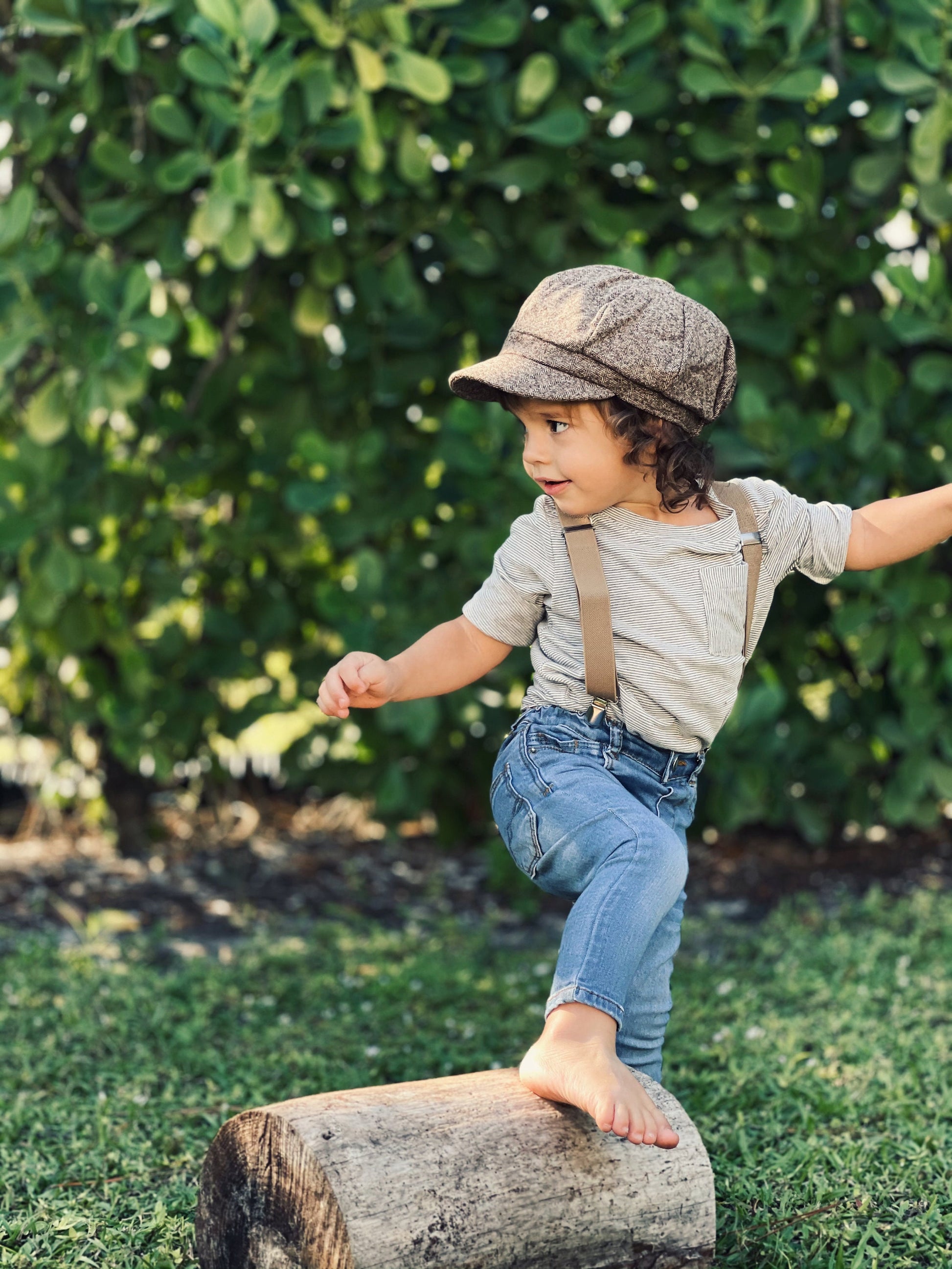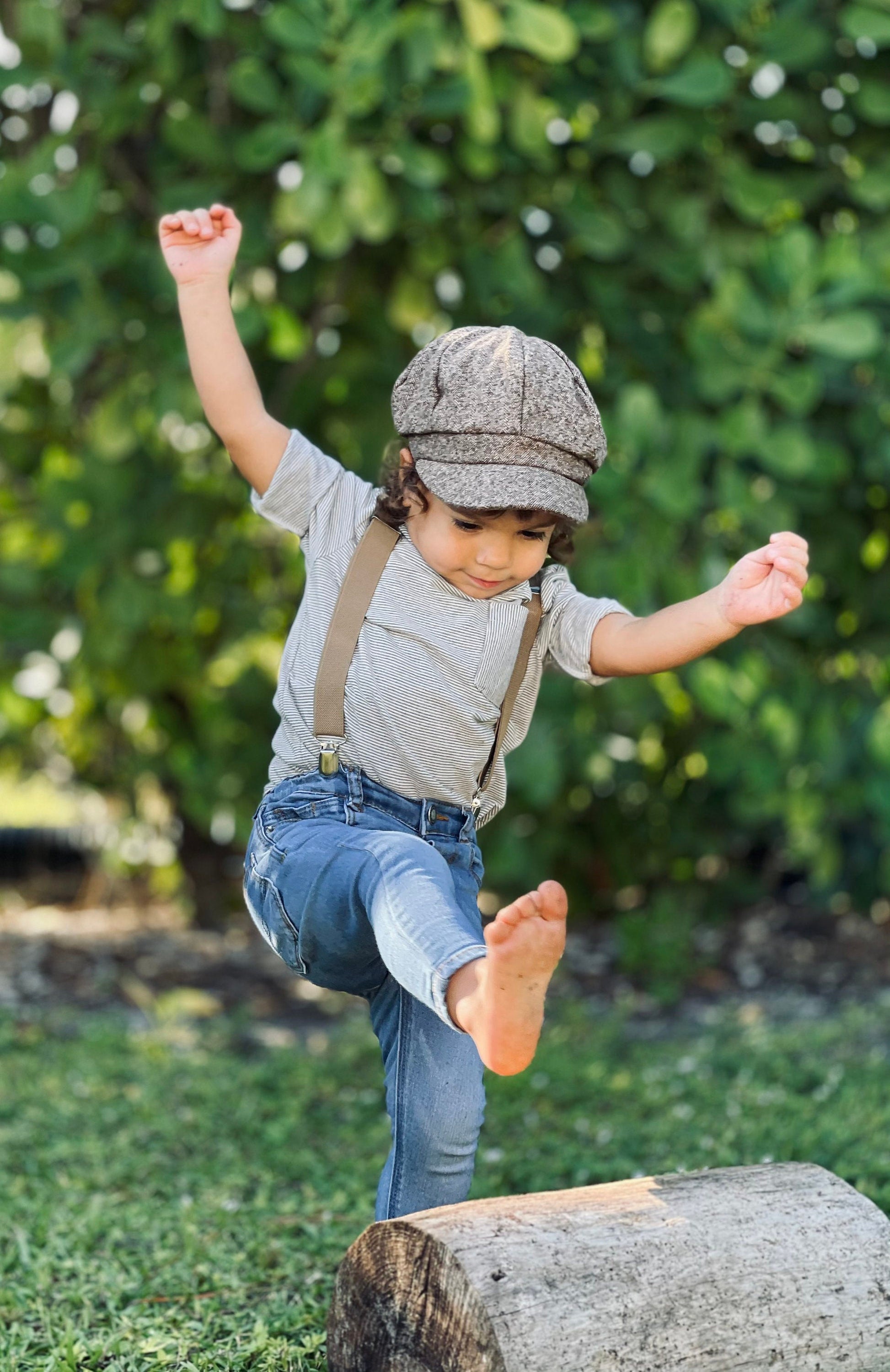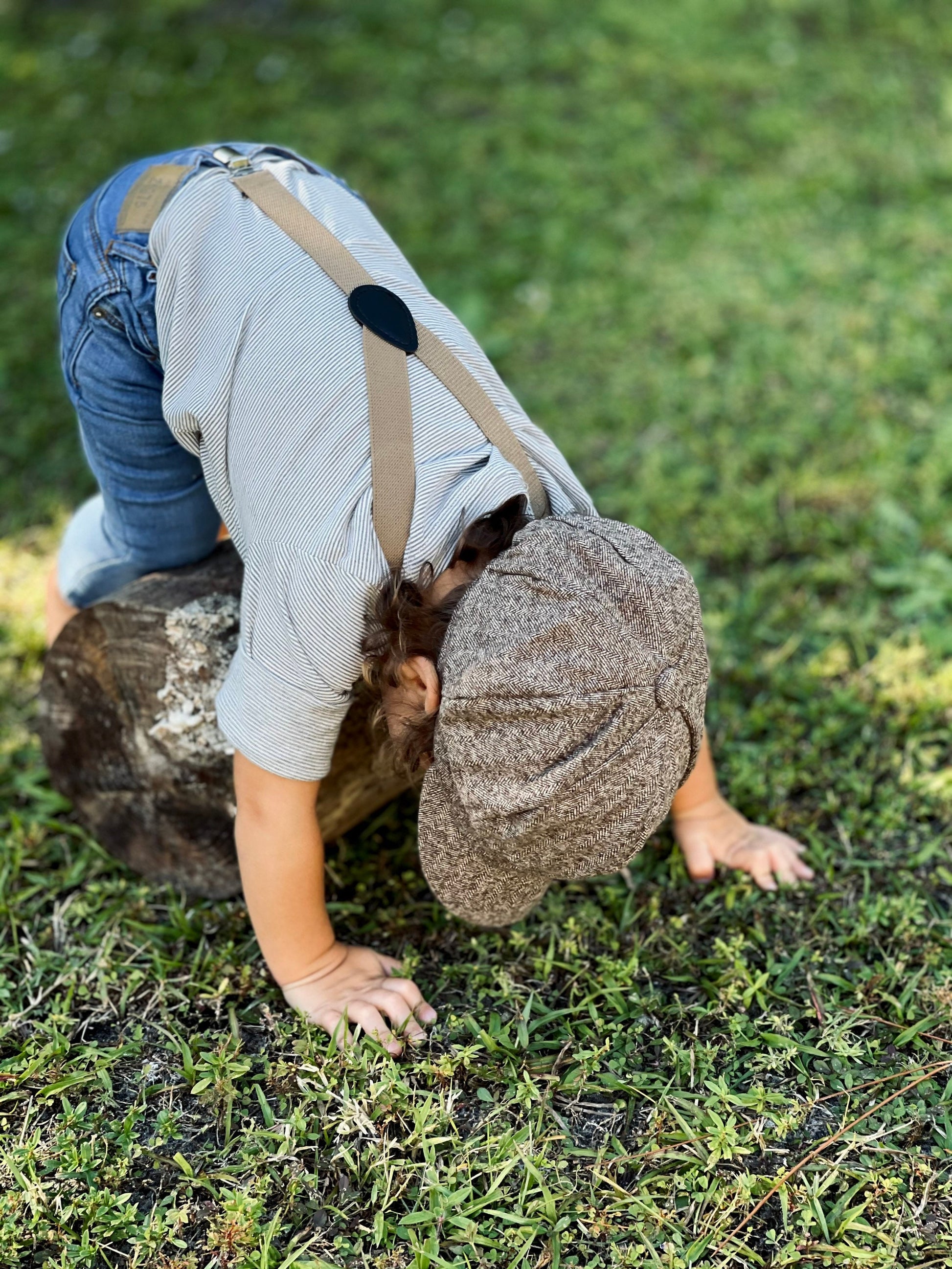 Your handsome guy will be stylish in his wool taupe brown newsboy cap and taupe suspenders. Perfect for groomsmen, best men, or ring bearers. Ideal for family photos, weddings, ring bearer outfits, birthday celebrations, or any special occasion. Contact us for FREE Color SAMPLES!
